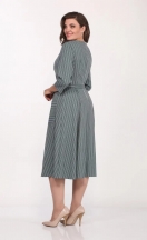 Платье А - силуэта, с круглым вырезом горловины, отрезное по линии талии. Перед лифа с нагрудными вытачками, юбка со встречными складками и накладными карманами. Спинка лифа с талиевыми вытачками, юбка со встречными складками, металлической тесьмой - "молнией" в среднем шве. Рукава втачные, одношовные, длиной 3/4. Платье комплектуется поясом.