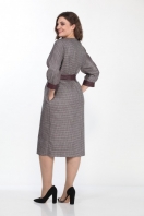 Платье женское, нарядное, из текстильной ткани, прямого силуэта, с цельнокроеным рукавом. Перед платья со средним швом, низ которого заканчивается разрезом. Перед с фигурным вырезом горловины и нагрудными вытачками. В боковых швах обработаны потайные карманы. Спинка цельная. Низ рукава со складками и отложной манжетой из кожи. Платье комплектуется съемным двухсторонним поясом из кожи и основной ткани. Цвет пояса и манжет гармонизирует с цветом изделия.