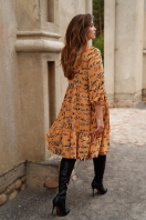 Платье женское свободного силуэта. Горловина оформлена воротником-стойкой, сразрезом и декоративными завязками по переду. Платье отрезное по линии талии сосборкой, понизу волан на сборке. Рукав цельнокроеный "реглан" длиной 3/4, понизуна резинке и с декоративными завязками.Длина изделия 97 см.Длина рукава от горловины 60 см.