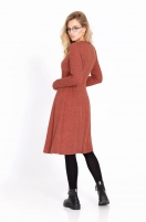 Трикотажное платье Х-образного силуэта из плотного трикотажного полотна. Детали: перед с двумя глубокими складками в рельефных швах, спинка с рельефами, фигурные кокетки, талиевые вытачки застрочены на лицо в качестве декора, потайная застежка-молния в среднем шве спинки, съемная брошь