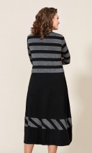 Имитация жакета удачно моделирует фигуру, а главный акцент – декоративные молнии и кружевная вставка гарантируют гармоничный образ. Платье А-образного силуэта, верхняя часть выполнена из трикотажа в полоску, на лифе расположены рельефы, декоративная молния и вставка из гипюра по центру, по юбке, выполненной из однотона расположены горизонтальные подрезы и вставка из трикотажа в полоску, декоративные молнии, вырез горловины- V- образной формы. Верхняя часть спинки выполнена из трикотажа в полоску, в нижней части из однотона выполнена вставка из трикотажа в полоску, в боковых швах расположены карманы на уровне бёдер. Рукав втачной одношовный. Длина рукава 50 см. Длина платья около 126 см. в зависимости от размера.