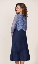 Гипюр с эффектом ришелье добавляет некоторую нарядность в образ, оставляя кокетливый модный шарм. Силуэт великолепно скрывает недостатки, платье сидит комфортно. Ткань отличная в уходе. По переду расположены нагрудные вытачки, подрез в области талии, центральная часть лифа выполнена с наложением гипюра на однотон, по юбке выполнены ассиметричные подрезы, воланы со сборкой и вертикальные защипы в верхней части. Вырез горловины округлой формы. По спинке расположен подрез в области талии, центральная часть верха выполнена с наложением гипюра, по юбке расположены ассиметричные горизонтальные подрезы с воланами и средний шов. Рукав втачной одношовный с притачной планкой из однотона по низу. Длина рукава 47 см. Длина платья около 118 см.
