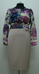Платье полуприлегающего силуэта, отрезное по линии талии. Длина по среднему шву спинки 98-100 см ( в зависимости от размера ). Лиф со сборкой. выполнен из шифона. Юбка прямая, слегка зауженная к низу. Пояс и манжеты выполнены с эффектом «крэш». Манжеты на застёжке на 4 навесные петли и пуговицы. Слева на поясе декоративный элемент (лазерная резка). В среднем шве спинки потайная молния. Платье на подкладке. Ткань плательно-костюмная + шифон.