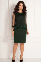 Платье для современных модных женщин любого возраста. Платье состоит из двух основных частей- это само платье и накидка(блузона).Платье полуприлегающего силуэта. Полочка прямая с нагрудными выточками. Спинка со средним швом и по линии талии нагрудные выточки. Горловина круглая. Сверху в качестве декоративной детали идет блузон накидка из сетки (фатина). Рукав тоже выполнен из сетки. Низ рукава и блузона украшен притачной отделочной тканью. Блузон соединен с основным платьем по горловине и пройме рукава. Полочка блузона ровная, расширенная к низу. Спинка состоит из двух деталей пересекающихся между собой. Спинка свободного кроя, расширенная к низу. Низ блузона короче спереди и плавно переходит в удлиненную спинку. Изделие на трикотажной подкладке. Основная ткань платья трикотажное полотно со стрейчем.