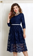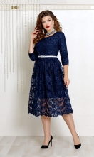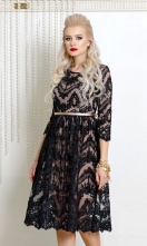 Платье женское, отрезное по линии талии, прилегающее в верхней части и А-образное в нижней. Перед верхней части с нагрудными и талиевыми вытачками. Горловина формы лодочка. Спинка верхней части с талиевыми вытачками. Нижняя часть платья со сборкой. Застёжка потайная тесьма-молния в боковом шве.Рукав втачной одношовный. Съёмный пояс. Длина рукава 48 см. Длина изделия 44-48 108 см; 50-52 117 см.