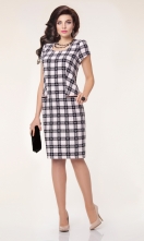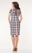 Модель классического полуприлегающего силуэта. Рукав втачной, короткий. По бедрам иммитированные кармашки, украшенные ажурной лентой. На спине вырез, прикрытый сеткой. По линии лопаток до уголка выреза декорированные ажурной лентой вставки. Внизу - иммитированная шлица, на несколько тонов темнее основного тона ткани. Длина платья 110см