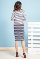 Стильное платье полуприлегающего силуэта, зауженное к низу, длиной ниже середины колена, с отлетной деталью лифа (юбка платья соединена с лифом подкладкой), с втачным рукавом, длиной до локтя. Юбка спинки с талиевыми вытачками. Отлетной перед платья состоит из двух асимметричных деталей, с нагрудными вытачками. Правая деталь переда с кантом по низу, левая деталь - с кантом по углу. Правая деталь настрочена на левую, имитируя планку. Горловина округлой формы. Платье украшает брошь.