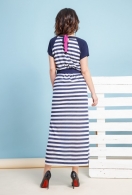 Стильное платье полуприлегающего силуэта длиной до щиколотки. Платье отрезное по линии талии с фиксированной резинкой. По лифу спинки у горловины обработан V-образный вырез, по переду - нагрудные вытачки от бокового. По юбке в боковых швах обработаны высокие разрезы, начинающиеся от уровня колена. По горловине - планки из отделочной ткани, обтачанные контрастной яркой тканью, переходящие в завязки по спинке. Рукава покроя реглан, короткие без верхнего шва. Платье на подкладке. По талии мягкий завязывающийся пояс из отделочной ткани, обтачанный яркой контрастной тканью.