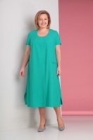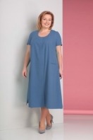 Изящное платье А-образного силуэта . По центру переда обработана складка , которая декорирована закрепками. На левой стороне изделия обработан прорезной карман с обтачками. На кокетке переда обработан не функциональный прорезной карман с обтачками. Спинка со средним швом. В боковых швах обработаны разрезы. Рукав короткий. На рост 164-170 см. Длина изделия 118 см. Длина рукава 24 см.