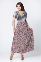 Описание: Платье женское полуприлегающего силуэта отрезное по талии из двух видов ткани (вискоза – тянется и плательная ткань – не тянется). Верх платье – лиф из вискозы в полоску. По переду отрезные кокетки, спинка цельнокроенная. По центру планка с блочками, через которые протянута кулиса. Рукав спущенный. Низ платья – юбка – удлиненная, расширенна к низу. В левый боковой шов вставлена потайная тесьма – молния. По талии две шлевки, через которые протянут декоративный пояс.
