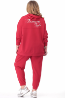 Женский костюм выполнен в спортивном стиле из трикотажного полотна состоит из бомбера и брюк. Бомбер прямого силуэта «оверсайз», с центральной застежкой на тесьму- молнию. По переду горизонтальные подрезы, обработаны накладные карманы. Спинка с кокеткой, плечевой шов смещен на перед, по центру - принт. Рукава спущенные, одношовные по низу с притачной манжетой. Горловина оформлена капюшоном с кулисой. Низ бомбера с притачным поясом и кулисой. Брюки прямого силуэта, слегка зауженные к низу, с притачной манжетой, внутри – эластичная тесьма. Передние половинки брюк с центральным швом, накладными карманами, на левой половинке – принт. Верхний срез оформлен поясом с эластичной тесьмой.